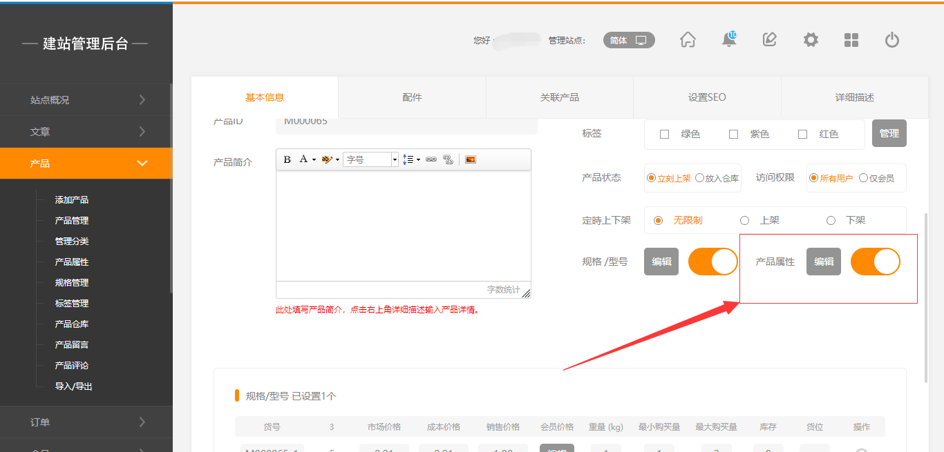 开启后选择该产品的产品属性